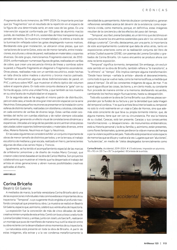 En el conjunto reunido nos encontraremos con elementos y vínculos originarios de esa naturaleza inimaginable que ya su obra anunciaba en extinción, pero también con la trasposición de sus unidades significantes, iluminando reflexiones contemporáneas sobre una intemperie que circunscribe el espacio eventual que habitamos: pasos volubles, oscilaciones repentinas, vibraciones inaprensibles donde la travesía indeterminada de los elementos del paisaje modelan el arrebato provisional de la historia privada y colectiva, de los íconos, monumentos, lugares y existencias urbanas que cada vez más coexisten bajo un cúmulo de herméticas desapariciones, sometidas por la contingencia de los vendales políticos, económicos y sociales que nos rodean. En la deliberación de estas instancias complejas a donde sólo llega el arte, Corina Briceño ha logrado dibujar las señales de ese mar al borde, extraños aluviones remotos que se abalanzan sobre el concreto, sombras de un viento citadino donde también se tambalea lo humano en su lucha por la sobrevivencia. En cada serie anida el reflejo de una circunstancia penetrada por el silencio y la turbulencia de lo incomprensible, pero dispuesta a brindar los movimientos de esa oleada que se pronuncia frente a las injusticias del contexto. En el adentro de la obra, el destacado transcurrir de los elementos consolidados a través de formatos, técnicas y soportes diversos, hacen posible la manifestación de un caudal donde la imagen franquea las posibilidades de la materia, ahora enaltecida por la labor interdisciplinaria de una creadora incansable.