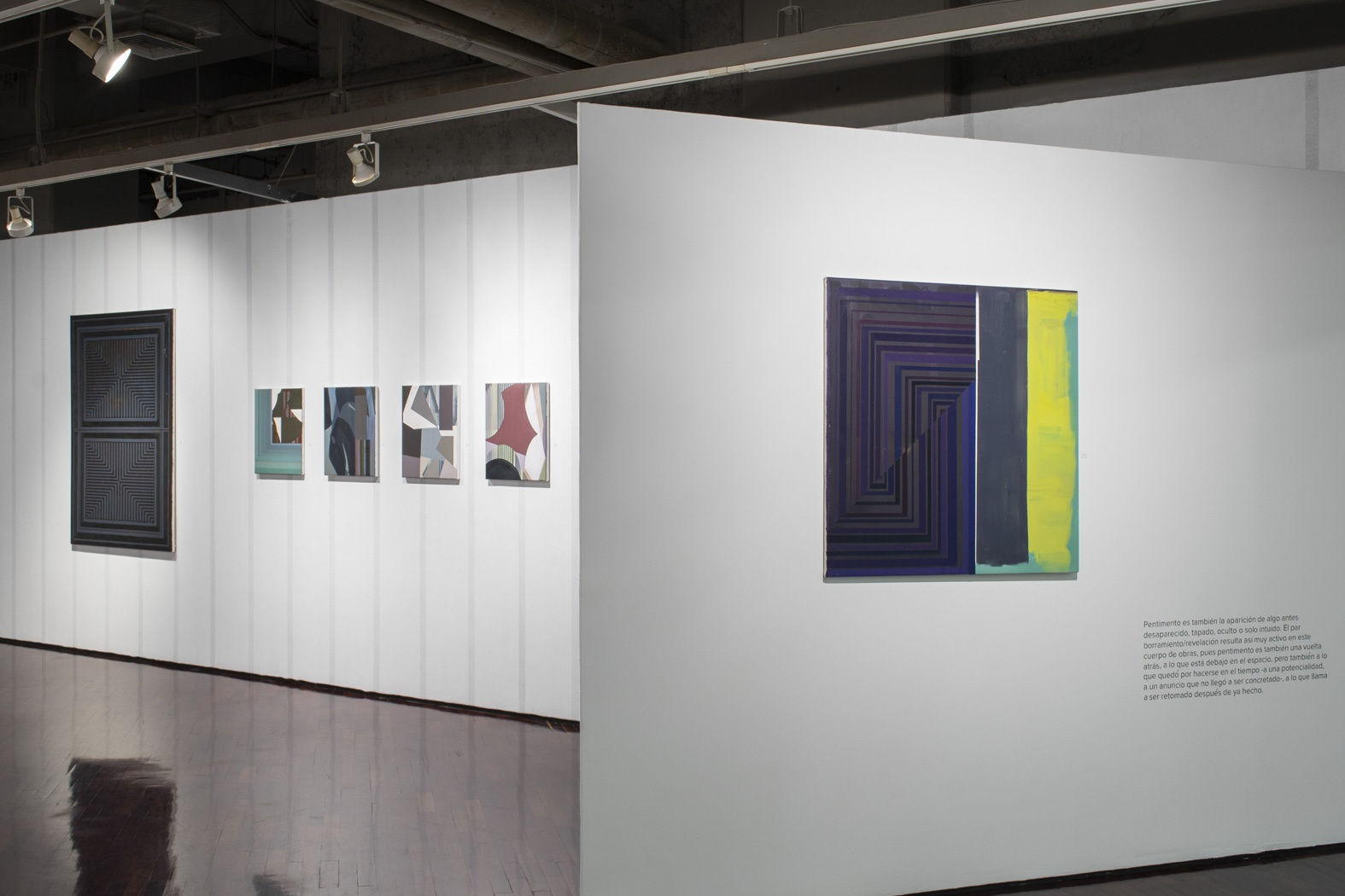 “Pentimento” es una palabra utilizada en la pintura clásica al hacerse evidentes procesos de cambio o correcciones dentro del cuadro; bajo este concepto se convierte en el temperamento central y la apuesta alegórica que acompaña a toda la exposición, avivando según apunta González, la reorganización de inquietantes estructuras sensibles donde ajustes, errores, permutas y mudanzas, son reconducidas por las ratificaciones de las capas pictóricas, creando detenciones en las perspectivas junto a nuevos avances que finalmente se levantan en el espacio expositivo para develar territorios imperceptibles, fracturas superpuestas mediante las cuales el artista interpela a la pintura en torno a la percepción individual y colectiva de una actualidad que navega a contrapunto entre el orden y el caos, la realidad y la ficción, la memoria y el olvido.