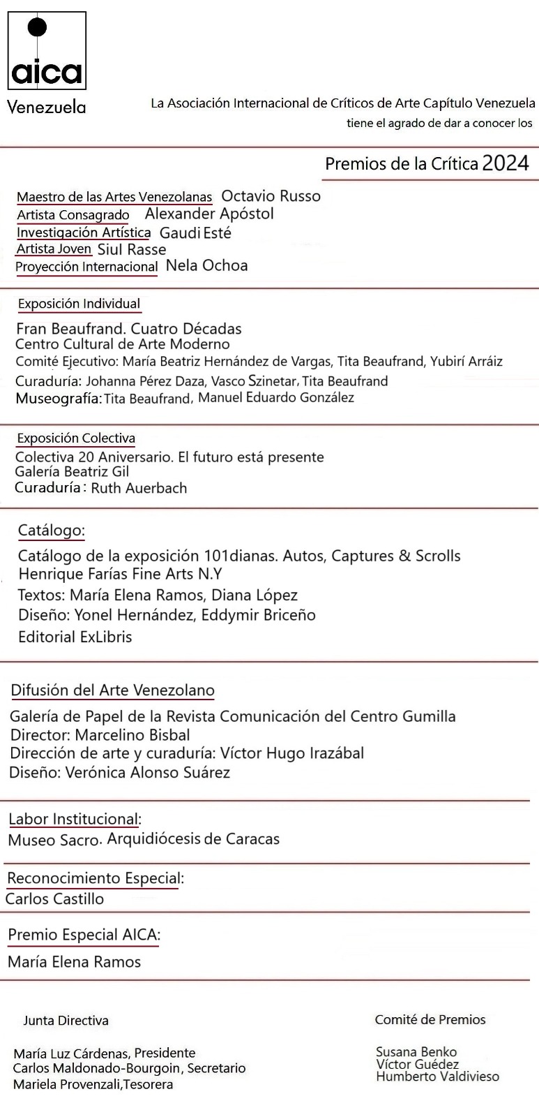 Agradecemos al jurado conformado por representantes de la AVAP, AICA-Unesco Capítulo Venezuela, la Fundación Gego, el CAV y Fundacav por reconocer la fuerza y profundidad de su propuesta.